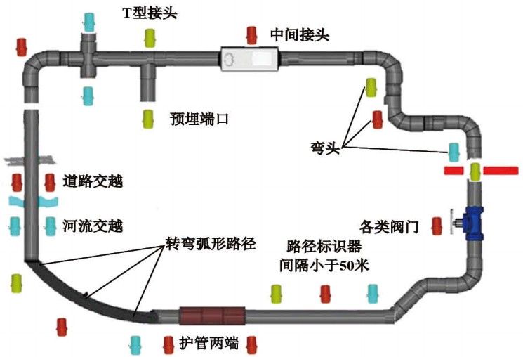 ·在地下管线末端、T型接头、预埋端口、中间接头、弯头、各类阀门、护管两端、转弯弧形路径、河流交越等处或正上方埋设电子标识器可以迅速*定位管线位置获取管线相关材质、用途、权属、监造维修等属性信息。